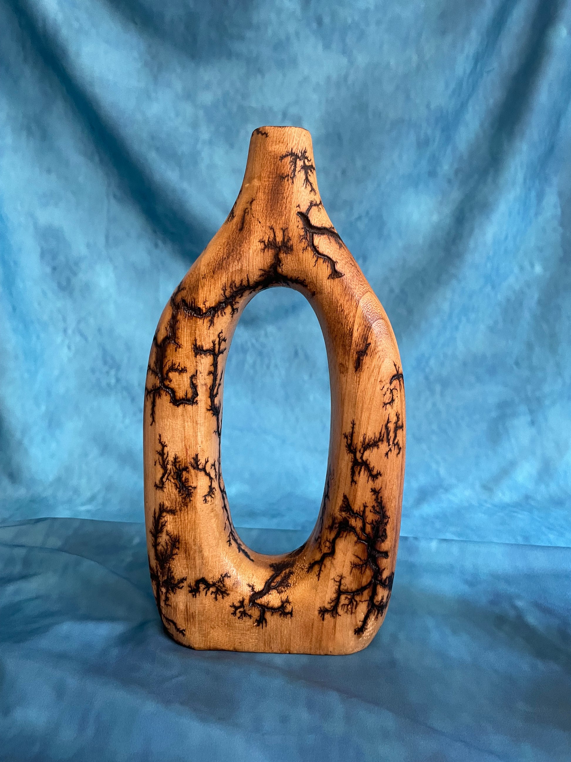 This 14" ornate and abstract vessel features a unique and hollow center, making it a stunning and functional addition to any space. Its intricate design adds a touch of elegance and sophistication, while its hollow center allows for versatile use as a decorative piece or add a glass sleeve and use as a functional vessel. The matching little brother to this will make this a complete set.